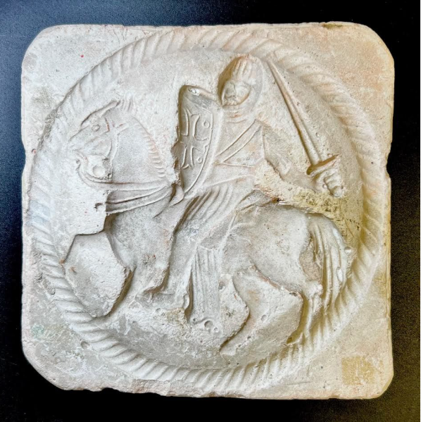 תבנית יציקה בה נראה פרש עם חרב ומגן רכוב על גבי סוס. התקופה הצלבנית.